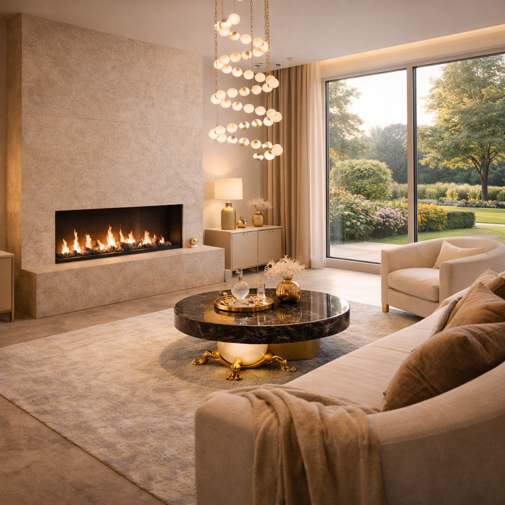 Stawiamy na formę, proporcje i detale: szlachetne materiały, ciepłe światło, wykończenia w tonach złota, beżu i czerni — w eleganckiej, harmonijnej równowadze.